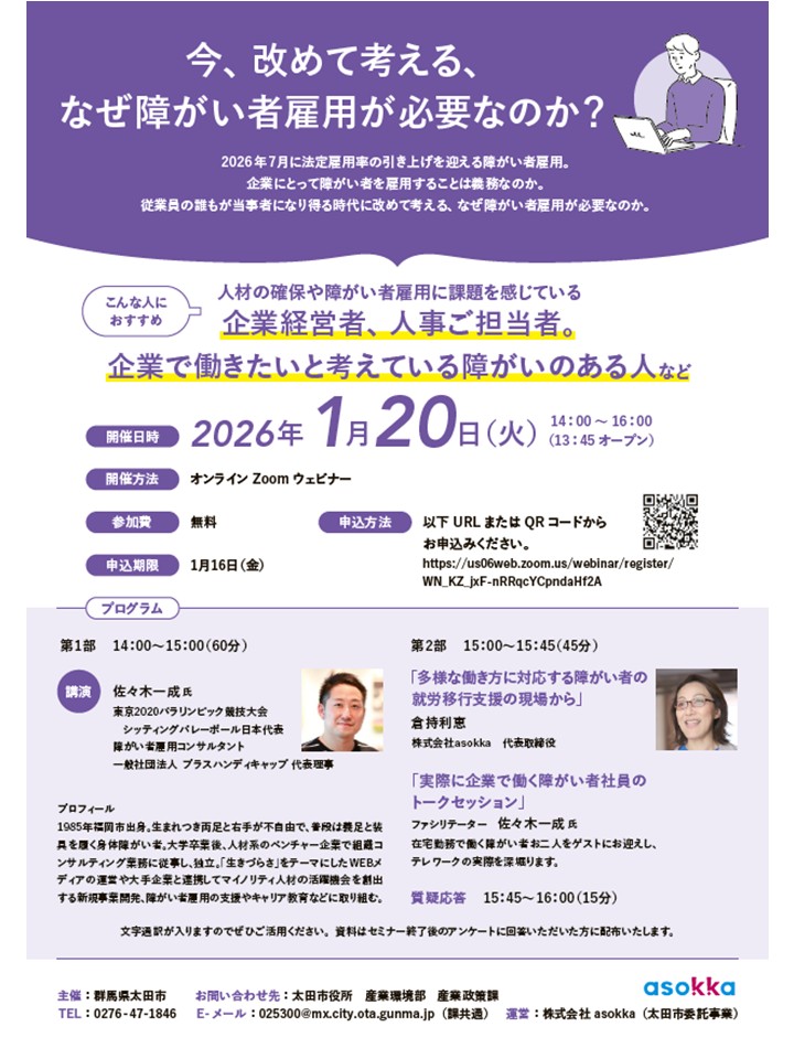 令和8年1月20日(火)開催の、群馬県太田市主催 障がい者雇用啓発セミナー「今、改めて考える、なぜ障がい者雇用が必要なのか?」(オンライン開催)へ、株式会社asokka 代表取締役 倉持利恵が講師として登壇いたします。